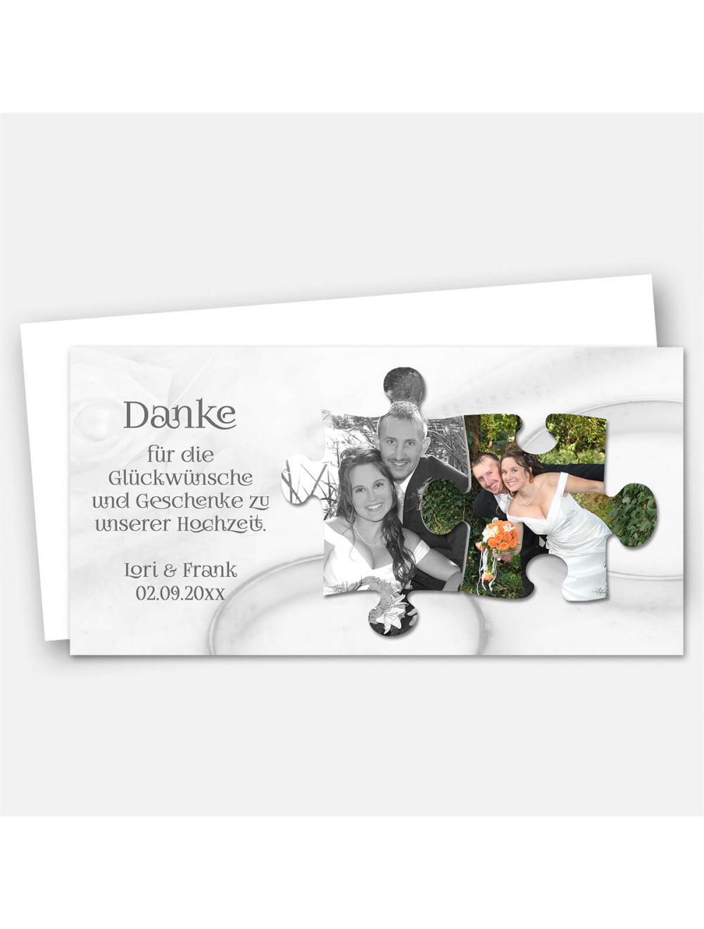 Beschreibung: Unsere Hochzeitsdankeskarte mit Ringen und zwei Puzzleteilen für ein oder zwei Fotos ist eine wunderbare Möglichkeit, um Ihre Gäste zu überraschen und ihnen zu zeigen, wie sehr Sie ihre Anwesenheit und ihre Unterstützung an Ihrem besonderen Tag geschätzt haben. Bestellen Sie noch heute und lassen Sie Ihre Gäste wissen, dass Sie sie nicht vergessen haben!