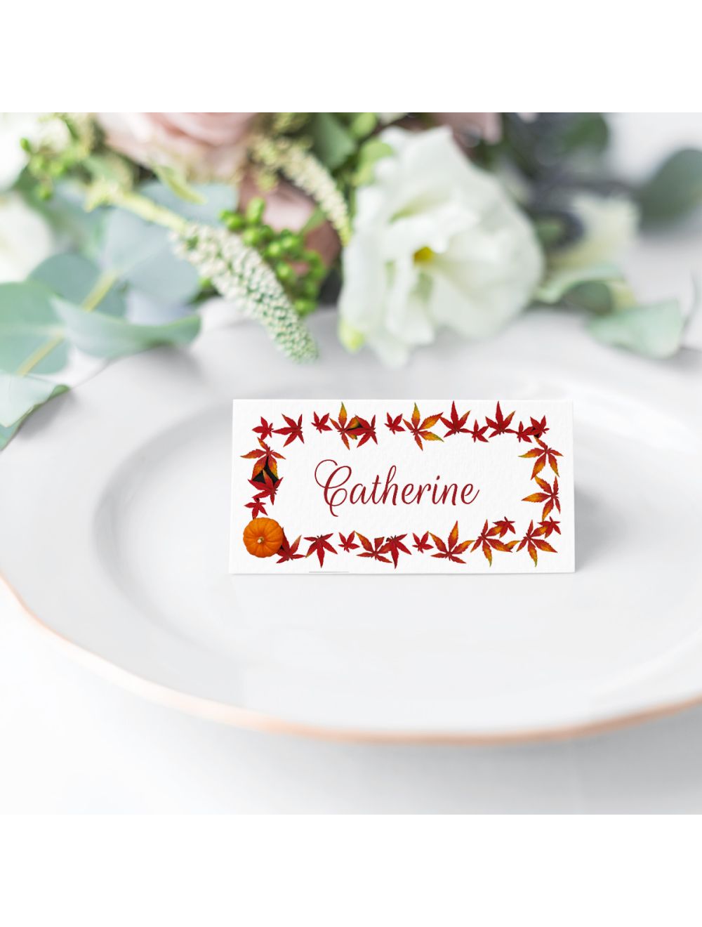 Eine freundliche "Girlande" aus buntem Herbstlaub umrahmt die weißen Tischkarten Geburtstag. Ein Kürbis in der linken, unteren Ecke der Tischkärtchen setzt herbstliche Akzente. Damit eignen sich diese Tischkärtchen nicht nur zum Erntedankfest, sondern auch im Oktober zu Halloween. Sie ist fröhlich und farbenfroh und kommt daher auch als hübsche Dekoration für den Kindergeburtstag bei den Kleinsten gut an. Die Rückseite der herbstlichen Tischkarten ist einfarbig weiß. So passen sie wunderbar auch auf bunte oder gemusterte Tischdecken. Da die Namenskarten sehr lebendig aussehen, sind Schreibschriften oder statische Schriften ohne Serifen eine gute Wahl. Als Schriftfarbe eignen sich die Farben der Blätter oder des Kürbisses. Damit sind Orange und Dunkelrot ebenso attraktiv, wie ein natürliches Grün.