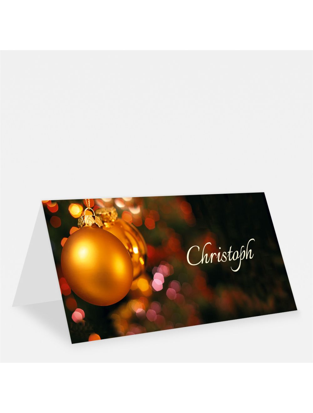 "Kugel" sind schillernde Tischkarten an Weihnachten, die festlicher kaum sein können. Glänzende, goldfarbene Kugeln leuchten weihnachtlich. Das wunderbare, stimmungsvolle Motiv zieht sich sowohl über die Vorder- als auch über die Rückseite der Namenskarten. Als Tischkarten zur Weihnachtsfeier können Sie optimalerweise einen weißen Schriftzug sowohl auf die Vorderseite als auch auf die Rückseite drucken lassen. Bei der gleichnamigen Menükarte beeindruckt eine große Version der goldenen Kugel in der Mitte der Karte. Diese dekorativen Karten verschönern jeden Weihnachtstisch und benötigen wenig und nur sehr dezente andere Tafeldekorationen.